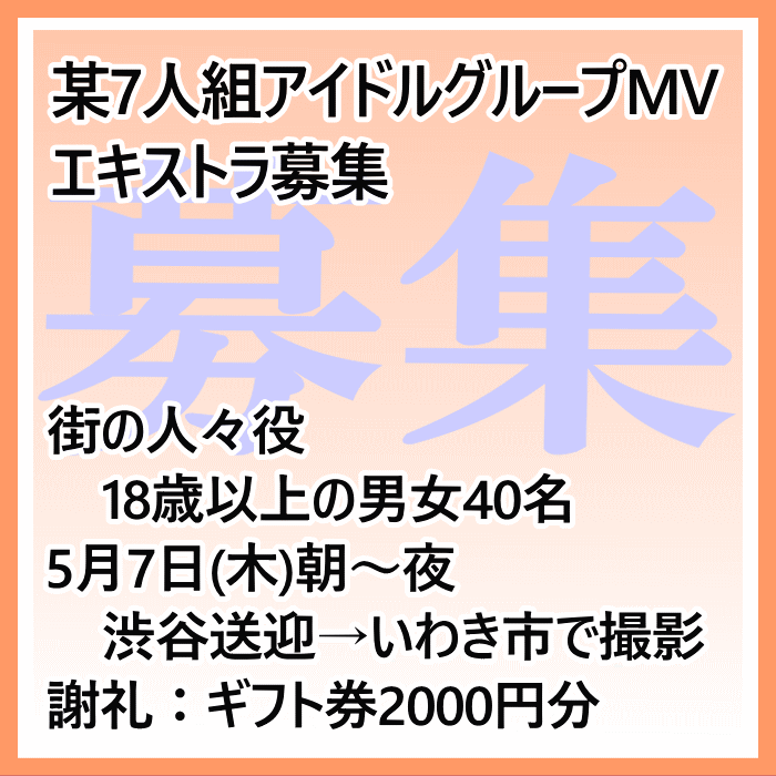 ご依頼により、ミュージックビデオのエキストラ募集情報をお知らせします。