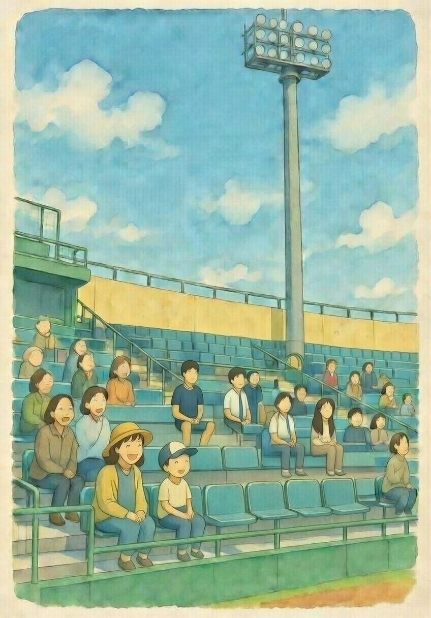 ←※画像は、AIに描かせた「野球場観客役のエキストラ」のイメージです。運営人が想像で指示を与えて描かせたものなので、実際の作品内容には必ずしも沿ってないと思います(というか、あんまり思う通りに描いてもらえない...)のでご理解のほどを。