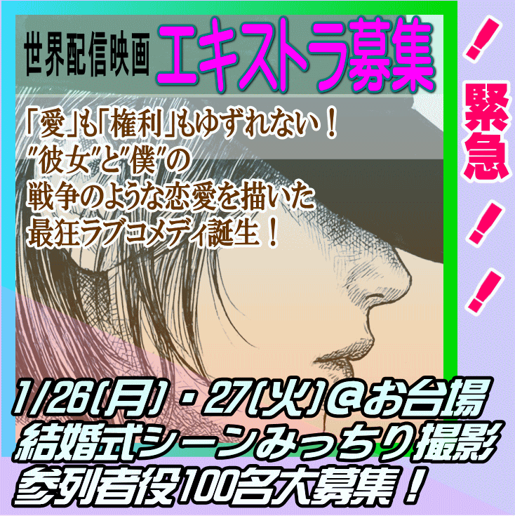 ......の撮影につき、エキストラさん100名急募の告知依頼をいただきました。