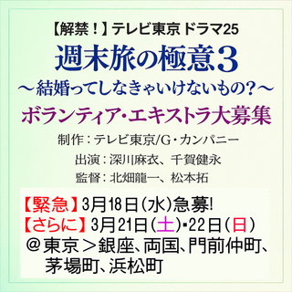 ・撮影日程が迫った「東京編」の募集がピンチ!とのことで、まずは3月18日(水)の募集情報を掲載しました。16日(月)13時締め切りです。