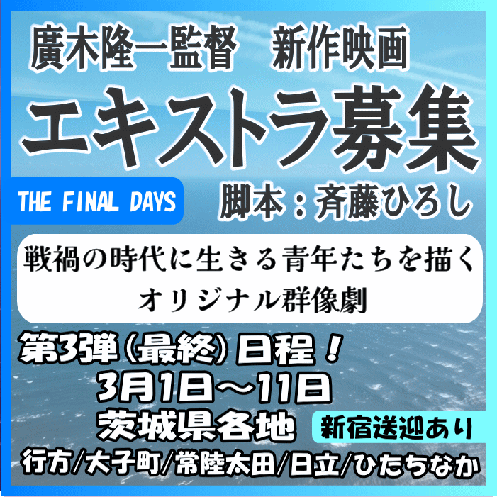 ※全体の撮影期間を通して、計5日以上のご参加で、クレジットにお名前を掲載いたします! - <エキストラ募集日程>