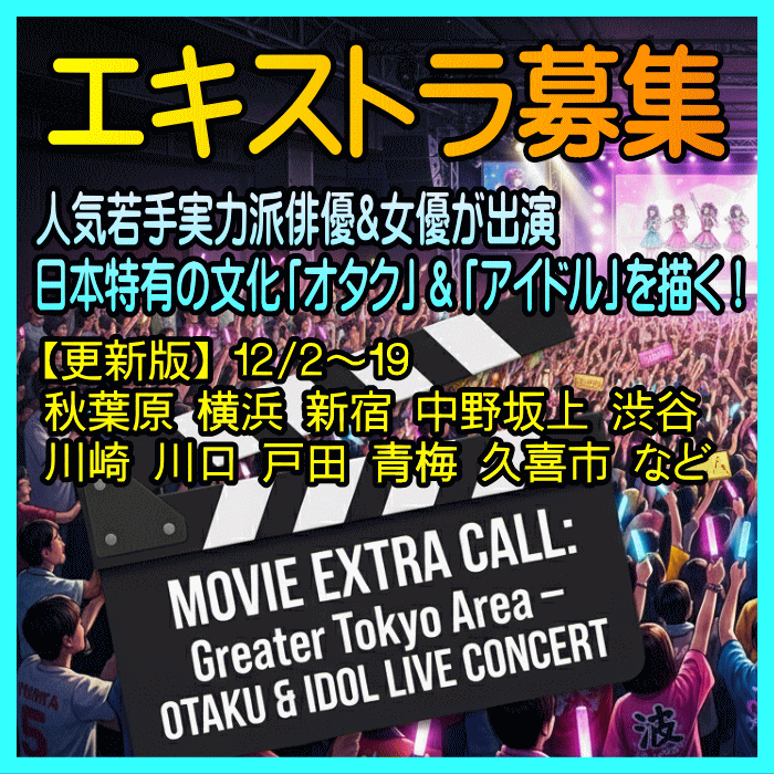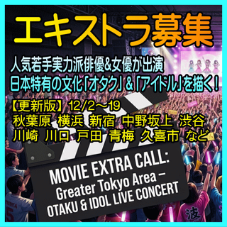 ・ライブシーン以外の募集日程が多数追加されました。 既報日程はすべて男性のみ対象でしたが、女性も応募可能な日程があります。(募集詳細に女性 と明記しました)