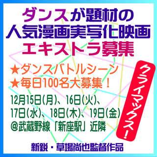 *12月15~19日の募集情報を新たに掲載しました。(ロケ地はすべて、JR武蔵野線沿線「新座」駅近隣の大型屋内スタジオです。駅からスタッフ車での送迎あり、駐車場なし。駅から直接徒歩だと30分程度?)