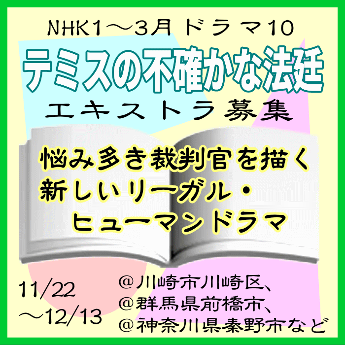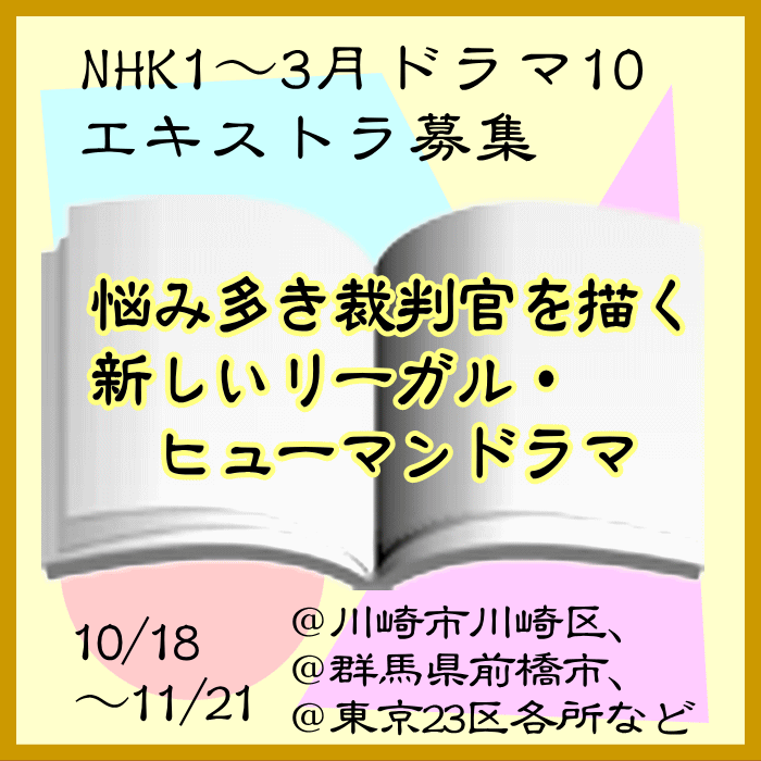 NHKの人気ドラマ枠「ドラマ10」の新作で、タイトル等は未公表ですが「リーガル・ヒューマンドラマ」とのこと。裁判所外観の通行や法廷の傍聴人役などの役柄が多数ありそうな雰囲気です。