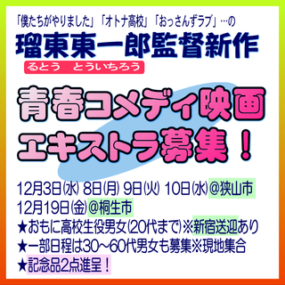 ドラマ「僕たちがやりました」、「オトナ高校」、「おっさんずラブ」など数々の人気ドラマや映画を手掛ける【瑠東東一郎監督】×【脚本:上田誠】のタッグで贈る、ある家族と一つの「高校」を舞台にした『青春コメディ映画』より、エキストラさん募集のお知らせです!