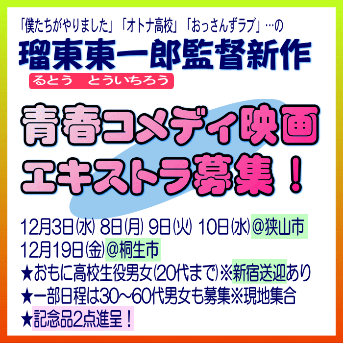 主要募集対象:高校生役男女(10代後半~20代◆12/3以外は新宿送迎あり)