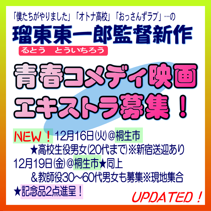 【12月19日(金)@桐生市】高校生役・教師役計109名大募集 [+] この行のクリックで詳細を開閉します