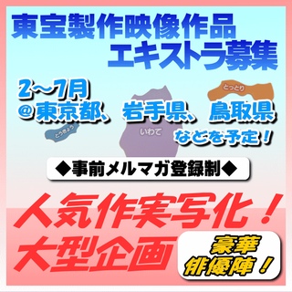 情報解禁前のため、作品名やキャストなど詳細をご案内できず恐縮ではございますが、東宝が製作する実写映像作品の撮影にご協力いただけるボランティアエキストラの皆様を募集いたします。