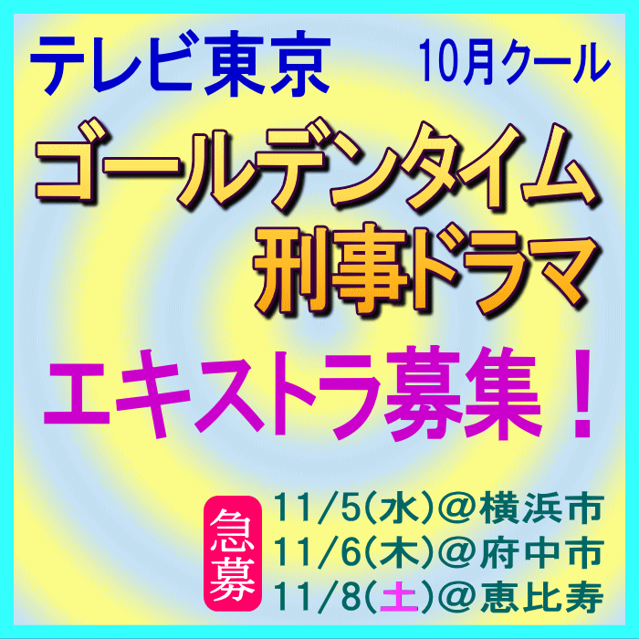 交通便利な東京都心各所での撮影が中心。役柄は刑事・警官役、街の通行人役など。対象年齢も全般に幅広い募集が多いようです。刑事ドラマ好きな皆さん、お見逃しなく。