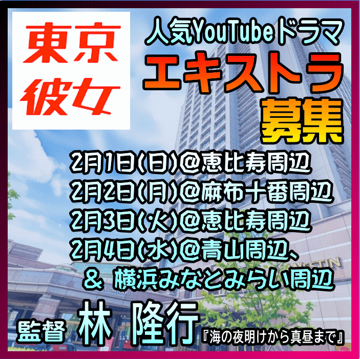 2026-10-31 急募!🔔人気YouTube10分ドラマシリーズ"東京彼女"2026年2月号エキストラ募集〓📅11/26か28@蒲田(ショークラブのシーン)、11/29@江戸川区(オフィスシーン)〓💛変身ヒーロードラマ出演グラビアモデル女優、有名ダンスグループダンサー、人気芸人が参加📢演出:磯部鉄平2025-10-31 緊急!🔔人気YouTube10分ドラマシリーズ"東京彼女"2026年1月号エキストラ募集〓📅11/3朝~昼前@麻布(婚活パーティーシーン)、20~30代男女急募〓💛TikTokインフルエンサー、元「坂道」系女優、2.5次元でも活躍中の俳優が参加📢演出:井上博貴