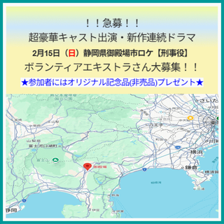 撮影は、2月15日(日)に静岡県御殿場市某所にて行われる予定で、エキストラの皆様には刑事役をお願いしたいと思っております。